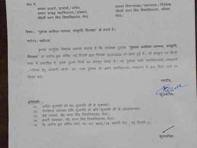 टाइम्स ऑफ इंडिया की रिपोर्ट के अनुसार, मेरठ यूनिवर्सिटी के रूप में पहचाने जाने वाले सीसीएसयू की कुलपति ने जिस किताब को खरीदने के लिए कहा है वह 'अयोध्या - परंपरा, संस्कृति, विरासत।' इस किताब को लेखक और कवि यतींद्र मिश्रा ने लिखा और यह ऑनलाइन प्लेटफॉर्म पर 6000 रुपये में उपलब्ध है।