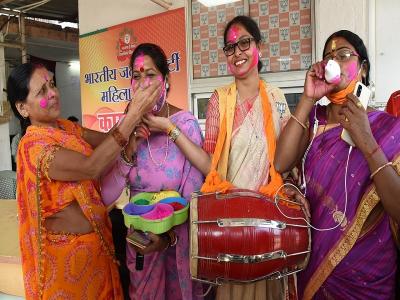 रुझानों में मिलती हुई जीत को देखकर भाजपा कार्यकर्ता अभी से जश्न के मूड में आ गये हैं। लखनऊ सहित प्रदेश भर में बीजेपी के दफ्तरों पर ढोल नगाड़े बजने शुरू हो गये हैं और कार्यकर्ता मिठाई बांटकर खुशी का इजहार कर रहे हैं।