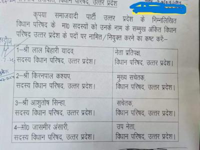 UP News: लाल बिहारी यादव होंगे विधान परिषद में नेता प्रतिपक्ष, अखिलेश ने किरण पाल कश्यप को मुख्य सचेतक, आशुतोष सिन्हा को सचेतक और जासमीर अंसारी को उप नेता नियुक्त किया