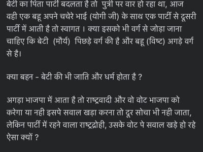 क्या बहन-बेटी की भी जाति और धर्म होता है। अगड़ा भाजपा में आता है तो राष्ट्रवादी और वो वोट भाजपा को करेगा या नहीं, इसपे सवाल खड़ा करना तो दूर सोचा भी नहीं जाता, लेकिन पार्टी में रहने वाला राष्ट्रद्रोही, उसके वोट पे सवाल खड़े हो रहे, ऐसा क्यों?