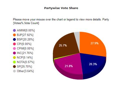 -वोट प्रतिशत की बात करें तो अभी तक सभी सीटों के आए कुल नतीजों के मुताबिक बीजेपी सबसे ज्यादा 27.9 फीसदी मत मिले। दूसरे नंबर पर सपा को 25.7 फीसदी तीसरे पर कांग्रेस को 21.8 तो 20.3 फीसदी मतों के साथ बसपा चौथे नंबर पर है।