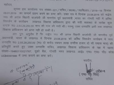एलडीए का कहना है कि पूर्व पीएम वाजपेयी के अस्थि विसर्जन कार्यक्रमों में 2.54 करोड़ रुपए खर्च हुए हैं। पूर्व प्रधानमंत्री स्वर्गीय अटल बिहारी बाजपेयी का उत्तर प्रदेश से गहरा नाता रहा है। ये बात किसी से छुपी नहीं, लेकिन उनकी मृत्यु के बाद लखनऊ में अस्थि विसर्जन का खर्च कोई विभाग उठाने को तैयार नहीं है।