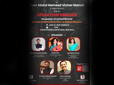 Operation Sindoor : राष्ट्रीय एकता और देशभक्ति की भावना के साथ, वीर अब्दुल हमीद विचार मंच आपको आमंत्रित करता है एक विशेष और विचारोत्तेजक कार्यक्रम में भाग लेने के लिए — “ऑपरेशन सिंदूर: संयुक्त भारत की प्रतिक्रिया– एक वैश्विक मिशन से गूंजती देशभक्ति" , जो रविवार, 22 जून 2025 को दोहर 2:00 बजे, कांस्टीट्यूशन क्लब ऑफ इंडिया, केंद्रीय सचिवालय के पास, नई दिल्ली में आयोजित किया जा रहा है।