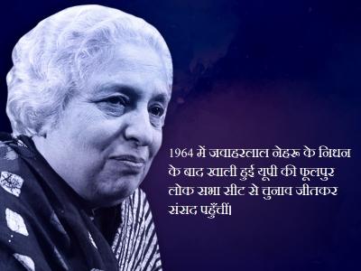8- 1964 में जवाहरलाल नेहरू के निधन के बाद खाली हुई यूपी की फूलपुर लोक सभा सीट से चुनाव जीतकर संसद पहुँचीं।