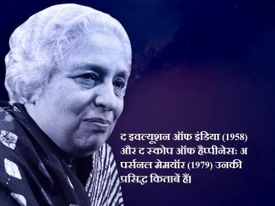 12- द इवल्यूशन ऑफ इंडिया (1958) और द स्कोप ऑफ हैप्पीनेस: अ पर्सनल मेमयॉर (1979) उनकी प्रसिद्ध किताबें हैं।