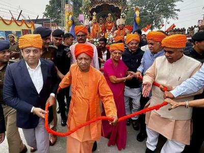 हेलीपैड से भगवान राम, अपने तीनों भाई, माता जानकी, हनुमान और गुरु वशिष्ठ के साथ रथ पर सवार होकर रामकथा पार्क स्थित कार्यक्रम स्थल की ओर बढ़े। बयान के अनुसार, भगवान राम जिस रथ पर माता सीता और अपने भाइयों के साथ सवार थे, उसे प्रदेश के मुख्यमंत्री योगी आदित्यनाथ, राज्यपाल आनंदी बेन पटेल और उप मुख्यमंत्री ब्रजेश पाठक खींच रहे थे।