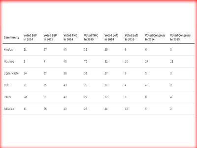 पश्चिम बंगाल में बीजेपी को आदिवासी, सवर्ण, ओबीसी, दलितों को वोट टीएमसी से ज्यादा मिला है। वहीं ममता बनर्जी को 70 फीसदी मुस्लिम वोट मिले हैं।