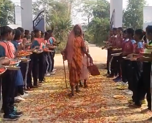 Lok Sabha Election 2024 phase 4: झारखंड के सिमडेगा में वोट डालने आईं बुजुर्ग महिला वोटर्स का स्वागत बच्चों ने पोलिंग बूथ पर फूलों से किया।