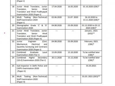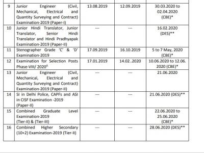 कलैंडर में अलग-अलग पदों पर वैकेंसी के लिए विज्ञापन जारी होने की तारीख, आवेदन शुरू होने की तारीख और आखिरी तारीख और परीक्षा की तारीख दिया गया है। इसके अलावा एग्जाम आयोजित होने के लिए माध्यम का भी उल्लेख है।