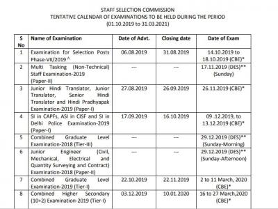 स्टाफ सिलेक्शन कमीशन (SSC) ने एक नया कलैंडर जारी कर दिया है। यह कलैंडर 1 अक्टूबर 2019 से 31 मार्च 2021 तक आयोजित होने वाले एग्जाम व उससे संबंधित महत्वपूर्ण तारीख के लिए है। इच्छुक उम्मीदवार इस कलैंडर को एसएससी की ऑफिशियल वेबसाइट ssc.nic.in पर जाकर डाउनलोड कर सकते हैं।