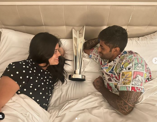 ज़रा हटके : सूर्यकुमार यादव ने पत्नी देविशा के साथ जीत का जश्न ऐसे किया सेलिब्रेट, विश्व कप ट्रॉफी को बीच में रखकर शेयर की तस्वीरें