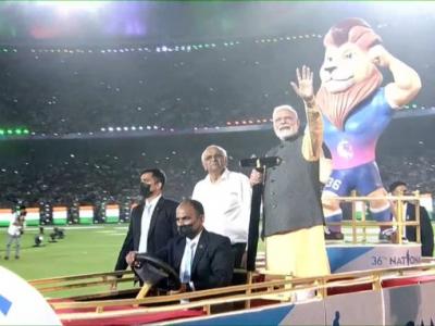 #WATCH PM Modi accompanied by Gujarat CM Bhupendra Patel greets the crowds at the opening ceremony of the 36th National Games at Narendra Modi stadium in Ahmedabad