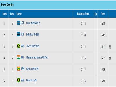 एथलेटिक्स (पुरुष): भारत के मोहम्मद अनस 400 मीटर में मेडल से चूके। फाइनल में 45.31 सेकेंड (नेशनल रिकॉर्ड) के साथ चौथे स्थान पर रहे।