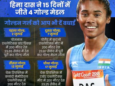 1st गोल्ड : 19 साल की हिमादास ने पहला गोल्ड मेडल 2 जुलाई को पोजनान एथलेटिक्स ग्रांड प्रिक्स में 200 मीटर रेस में जीता था। उन्होंने 23.65 सेकंड में रेस पूरा कर गोल्ड पर कब्जा किया था।
