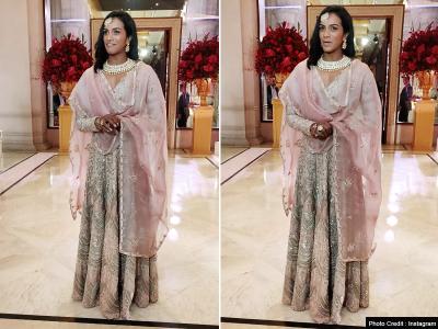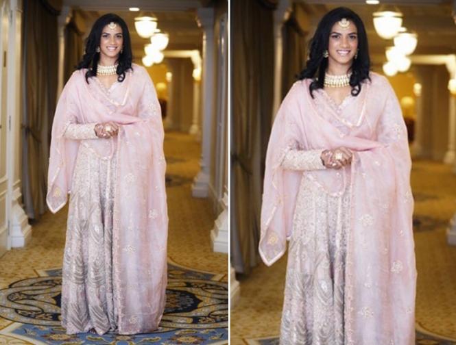पीवी सिंधू लाइट बेबी पिंक कलर के लहंगा में नजर आईं।