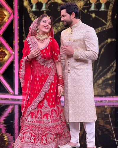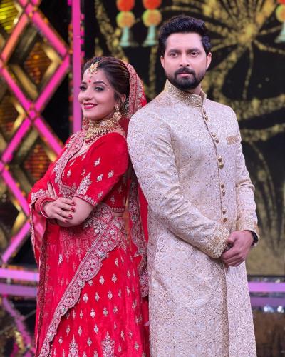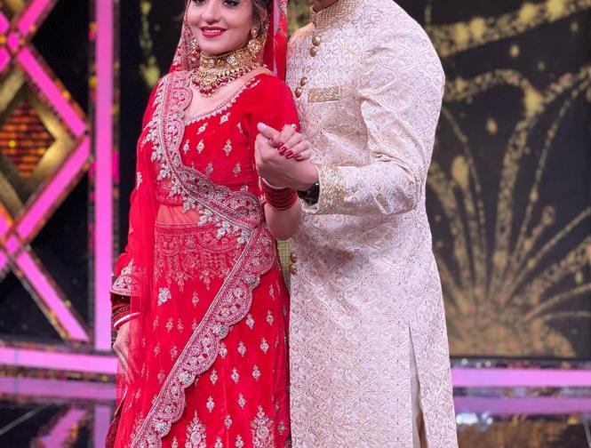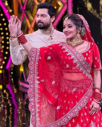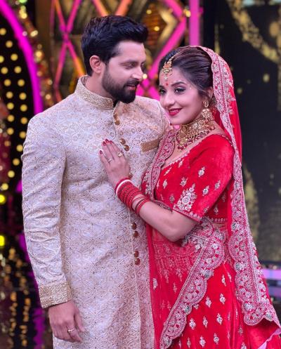 मोनालिसा ने फोटोज शेयर करते हुए कैप्शन में लिखा है- 'एक रियलिटी शो में हमारी शादी के पलों को फिर से जी रहे हैं'। (फोटो: इंस्टाग्राम)