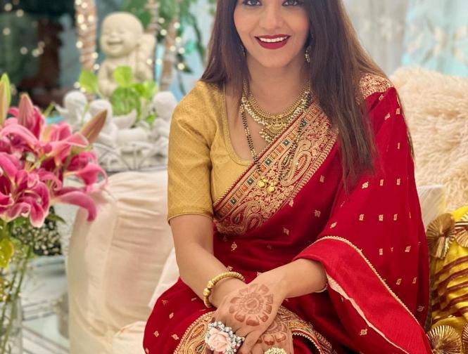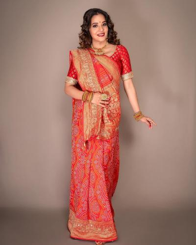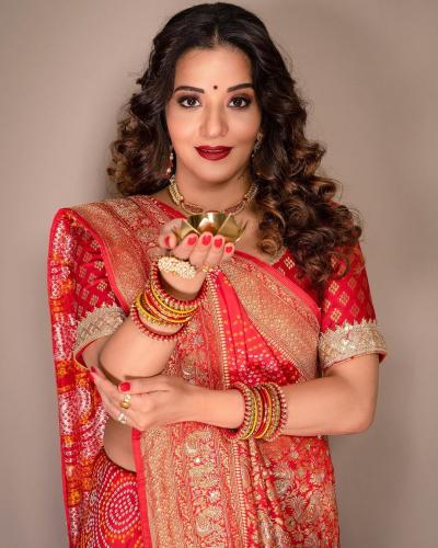 मोनालिसा ने लाल कलर की साड़ी पहने हुए हैं, जिस पर गोल्डन प्रिंट डिजाइन किए गए हैं। (फोटो: इंस्टाग्राम)