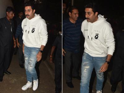 रितेश देशमुख के बेटे की बर्थडे पार्टी में अभिषेक बच्चन सफेद रंग की हूडी और जूतों के साथ ब्लू कलर की जींस पहने हुए थे।