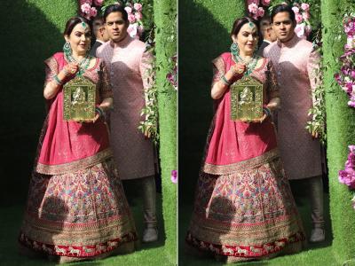 नीता अंबानी हाथ में भगवान् की मूर्ति लिए हुए दिखीं