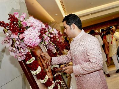 आकाश अंबानी अपने दादा धीरूभाई अंबानी की तस्वीर को तिलक करते हुए