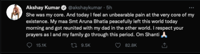 अक्षय कुमार ने सोशल मीडिया पर ट्वीट करते हुए कहा कि ‘वह मेरी कोर थी। आज मैं अपने अस्तित्व के मूल में एक असहनीय दर्द महसूस कर रहा हूं। मेरी माँ श्रीमती अरुणा भाटिया आज सुबह शांतिपूर्वक इस दुनिया को छोड़कर दूसरी दुनिया मे चली गई है। मैं आपकी प्रार्थनाओं का सम्मान करता हूं ''ओम शांति''।