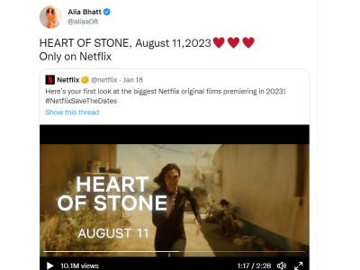अलिया ने ट्विटर पर वीडियो शेयर किया है जिसमें आठवें नंबर पर फिल्म 'हार्ट ऑफ स्टोन' है। (फोटो- इंस्टाग्राम)