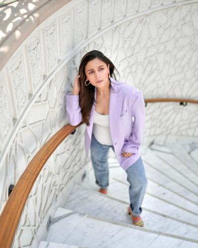 लैवेंडर कलर की जैकेट और डेनिम में आलिया भट्ट ने कराया फोटोशूट, सीढ़ियों पर दिए पोज