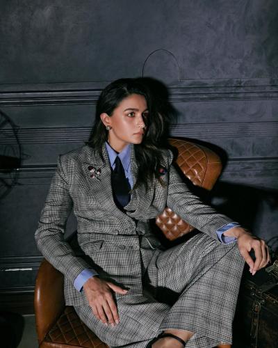 इन तस्वीरों में आलिया भट्ट ब्लू शर्ट और डार्क ब्लू टाई के साथ चेक सूट पैंट पहने नजर आ रही हैं। (फोटो: इंस्टाग्राम)