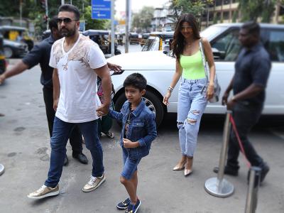 शिल्पा अपने पति राज कुंद्रा और बेटे के साथ लंच करने पहुंची