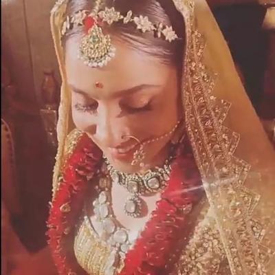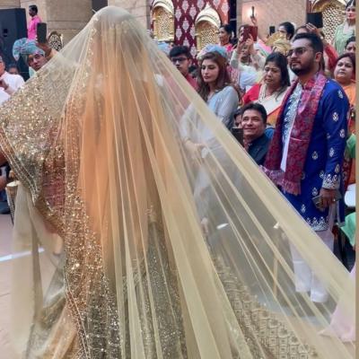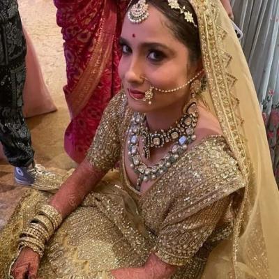 अंकिता लोखंडे ने गोल्डन लहंगा चुना और इसे लॉन्ग वील के साथ पेयर किया।