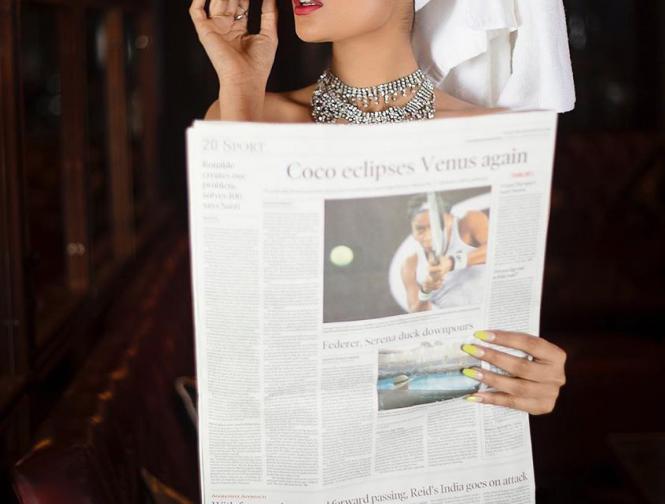 फोटो में एक्ट्रेस ग्लैमरस अंदाज में अखबार पढ़ती नजर आ रही हैं