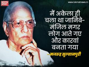 1 / 9मैं अकेला ही चला था जानिबे-मंजिल मगर लोग आते गए और कारवां बनता गया - मजरूह सुल्तानपुरी2 / 9बचा लिया मुझे तूफां की मौज ने वर्ना किनारे वाले सफीना* मिरा डुबो देते - मजरूह सुल्तानपुरी3 / 9रहते थे कभी जिनके दिल में, हम जान से भी प्यारों की तरह बैठे हैं उन्हीं के कूंचे में हम, आज गुनहगारों की तरह - मजरूह सुल्तानपुरी4 / 9दुनिया करे सवाल तो हम क्या जवाब दें, तुमको ना हो ख्याल तो हम क्या जवाब दें - मजरूह सुल्तानपुरी5 / 9ऐसे हंस हंस के न देखा करो सब की जाननिब लोग ऐसी ही अदाओं पे फ़िदा होते हैं - मजरूह सुल्तानपुरी6 / 9बहाने और भी होते जो ज़िंदगी के लिए हम एक बार तिरी आरज़ू भी खो देते - मजरूह सुल्तानपुरी7 / 9कोई हम-दम न रहा कोई सहारा न रहा हम किसी के न रहे कोई हमारा न रहा - मजरूह सुल्तानपुरी8 / 9पारा-ए-दिल है वतन की सरज़मीं मुश्किल ये है शहर को वीरान या इस दिल को वीराना कहें - मजरूह सुल्तानपुरी9 / 9ज़बाँ हमारी न समझा यहाँ कोई 'मजरूह' हम अजनबी की तरह अपने ही वतन में रहे - मजरूह सुल्तानपुरी