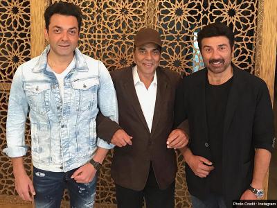 एक प्रोग्राम के दौरान अपने पिता धर्मेंद और बिग ब्रदर सनी पाजी के साथ कूल लुक देते बॉबी।