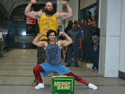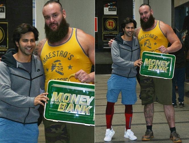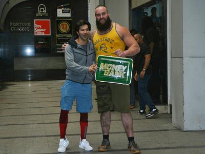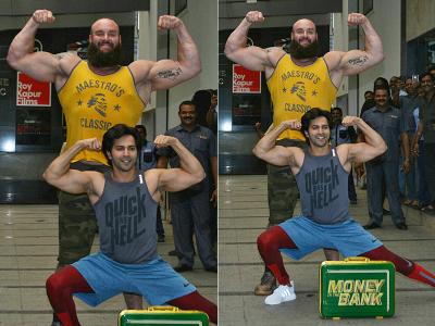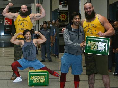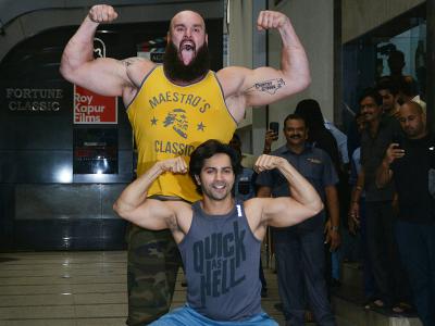 वरुण धवन ने रेसलर ब्रॉन स्ट्रोमैन के साथ दिए बाइसेप्स पोज़, देखें तस्वीरें