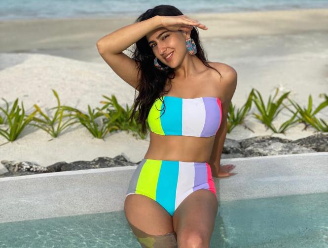 सारा अली खान का समंदर किनारे ग्लैमरस लुक, मल्टीकलर स्विमवियर में शेयर की तस्वीरें