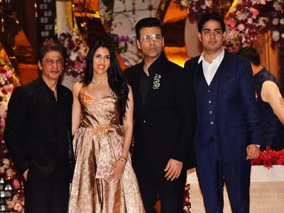 इस तस्वीर में शाहरुख खान, करण जौहर, आकाश अंबानी और श्लोका मेहता फोटो क्लिक कराते हुए नजर आ रहे हैं।