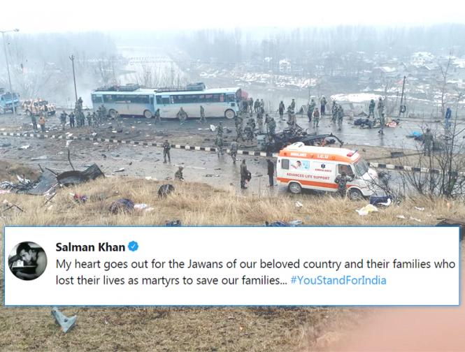 पुलवाना हमले पर सलमान खान ने लिखा है कि देश प्रेम के लिए अपनी जान देने वाले सीआरपीएफ जवानों की शहादत पर मेरा दिल रो रहा है