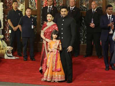 ऐश्वर्या राय, अभिषेक बच्चन अपनी बेटी आराध्या के साथ पहुंची थीं, ऐश्वर्या ने लाल रंग की साड़ी के साथ मांग में सिंदूर सजा रखा था
