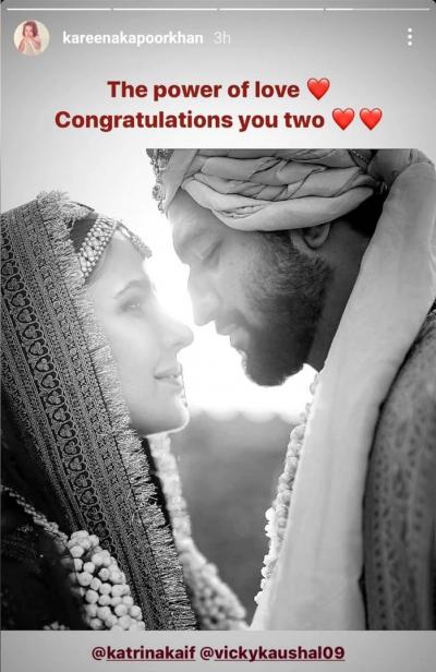 एक्ट्रेस करीना कपूर खान ने अपने इंस्टाग्राम पर विक्की और कैटरीना की खूबसूरत फोटो शेयर की और कैप्शन में लिखा है, 'प्यार की ताकत, आप दोनों को बधाई'। (फोटो: इंस्टाग्राम)