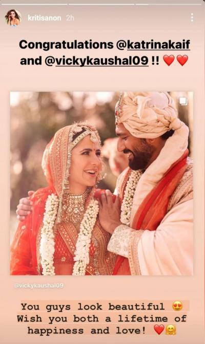 बॉलीवुड एक्ट्रेस कृति सेनन ने विक्की और कैटरीना को शादी की मुबारकबाद देते हुए उनकी प्यारी से फोटो शेयर की है। (फोटो: इंस्टाग्राम)