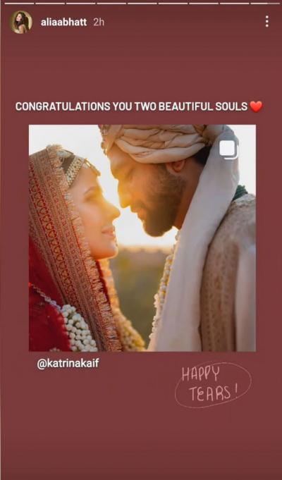 एक्ट्रेस आलिया भट्ट ने भी इंस्टाग्राम स्टोरी में विक्की और कैटरीना की फोटो शेयर करते हुए कैप्शन में लिखा है, 'बधाई हो आपको दो खूबसूरत सोल'। (फोटो: इंस्टाग्राम)