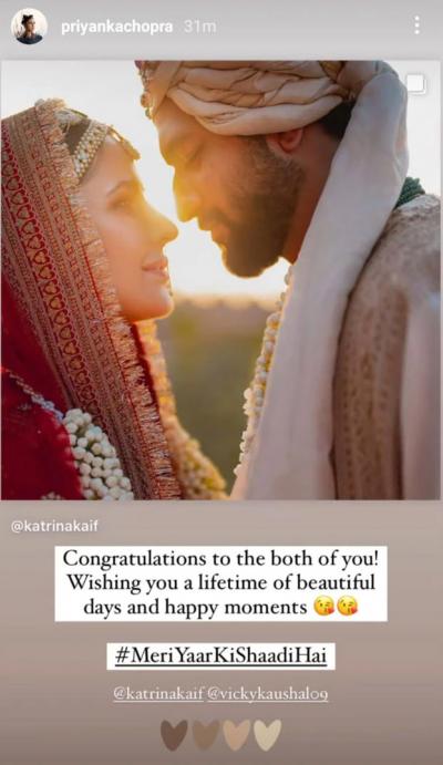 स्टाइलिश एक्ट्रेस प्रियंका चोपड़ा ने भी अपनी इंस्टाग्राम स्टोरी में फोटो शेयर करते हुए प्यारा सा मैसेज लिखा है #MereYaarKiShaadiHai