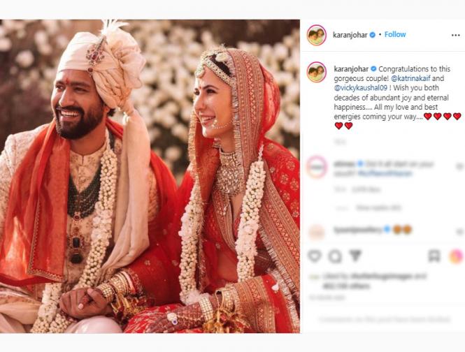 करण जौहर ने विक्की कौशल और कैटरीना कैफ को शादी की बधाई देते हुए फोटो शेयर की है। (फोटो: इंस्टाग्राम)