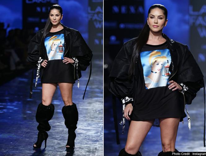 मुंबई में चल रहे 'लैक्मे फैशन वीक' के दौरान रैम्प पर क्रिएशन पेश करतीं बॉलीवुड अभिनेत्री सनी लियोनी।