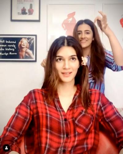 हाल ही में एक्ट्रेस कृति की बहन नुपुर सेनन ने एक विडियो पोस्ट किया है, जिसमें वो कृति को हेयर कट देती हुई नजर आ रही हैं। (फोटो: इंस्टाग्राम)