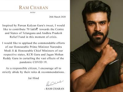तेलुगु सुपरस्टार राम चरन ने केंद्र, आंध्र प्रदेश और तेलंगाना सरकारों को 70 लाख रुपये डोनेट किये हैं। राम चरन ने प्रधानमंत्री नरेंद्र मोदी और राज्य सरकारों के प्रयासों की तारीफ़ भी की है।