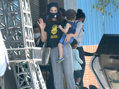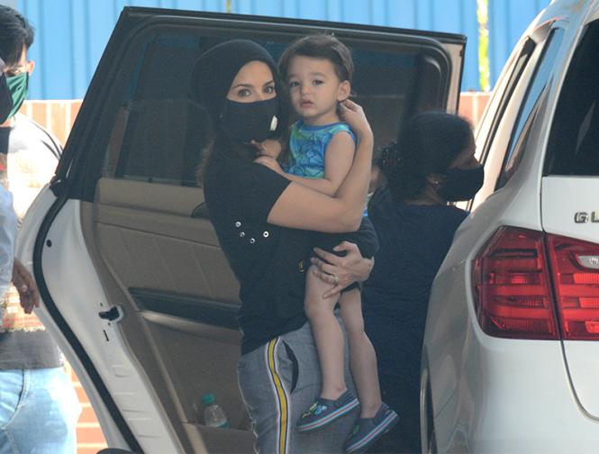 सनी यहां प्ले स्कूल के बाहर अपने बेटे को गोद में उठाए हुए नजर आईं।