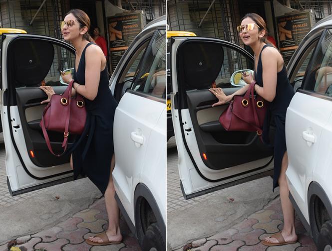हाल ही में रकुल ब्लैक कलर की बोल्ड ड्रेस में मुंबई के जुहू में क्लिनिक के बाहर अपने स्टाइलिश अंदाज़ में दिखीं।