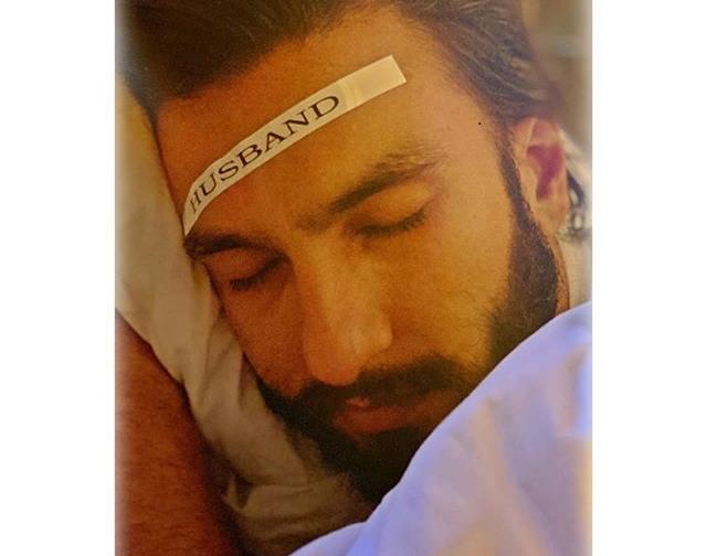 दीपिका पादुकोण ने सोते हुए रणवीर सिंह के माथे पर लगाया लेबल, देखें फोटो