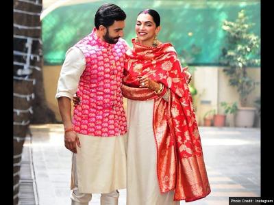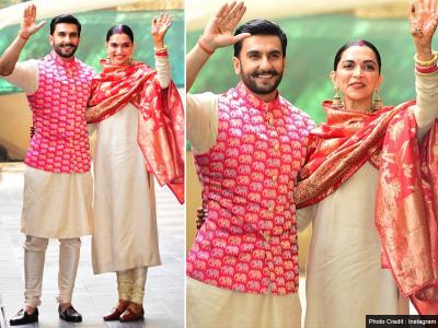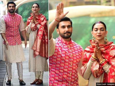 दीपिका यहां गोल्डन रंग के सूट में दिखीं, जबकि रणवीर ने कुर्ते पायजामे के साथ पिंक रंग की कोटी पहनी।